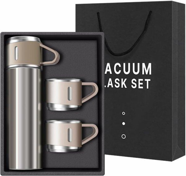 Premium Stainless Steel Thermos: Insulated for hot and cold beverages.' 'Double-Wall Design: Maintains optimal temperature for longer durations.' '500ml Capacity: Perfect for on-the-go hydration, hot or cold.' 'Gift Set Inclusivity: Complete with 2 stainless steel cups.' 'Silicone Handle: Comfortable grip for easy portability.' 'Insulated Lid: Ensures drinks stay at the desired temperature.' 'Versatile Use: Ideal for travel, outdoor activities, and daily routines.' 'Quality Craftsmanship: Durable and stylish thermos for any lifestyle